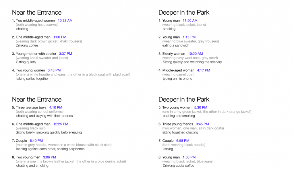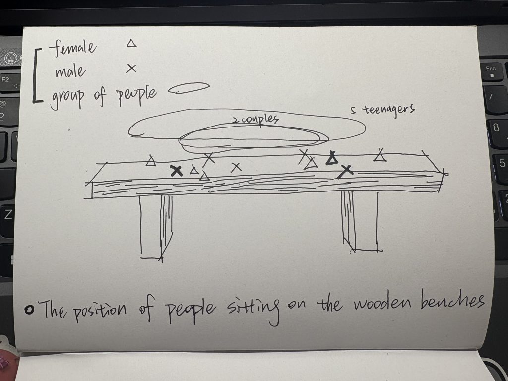 During the research, I noticed small but repeated differences: women often stopped for a short rest while pushing strollers, middle-aged men gathered at the benches deeper inside the park to play cards, and many people chose the three-quarter position of the bench for a sense of comfort and semi-privacy. These small habits formed a quiet system of their own, showing how environment, routine and social roles shape the way people use public space.