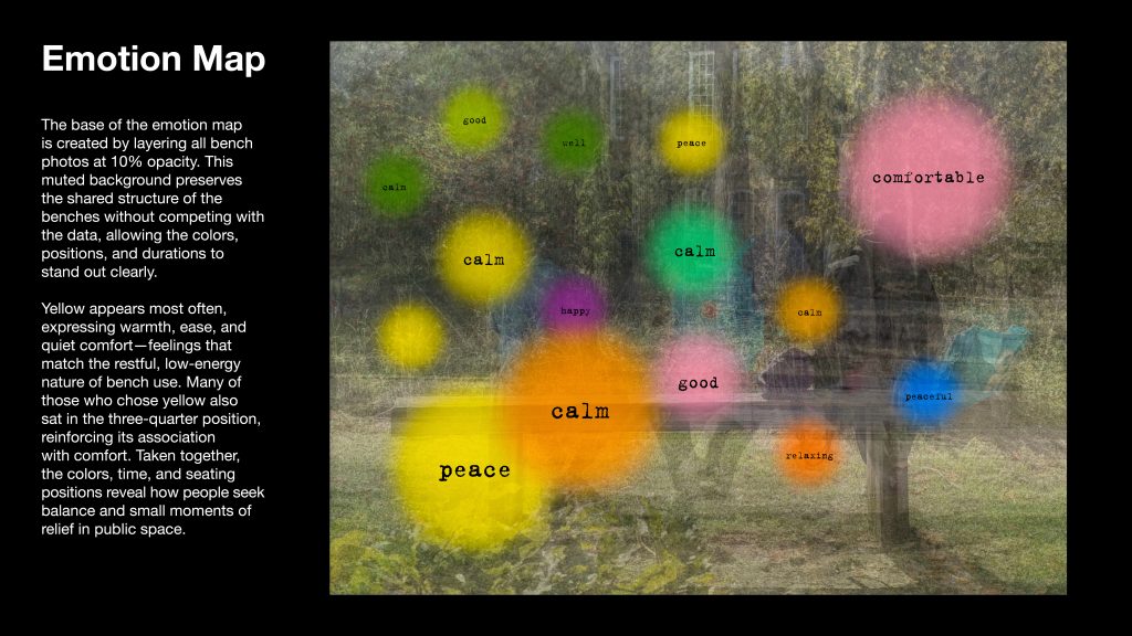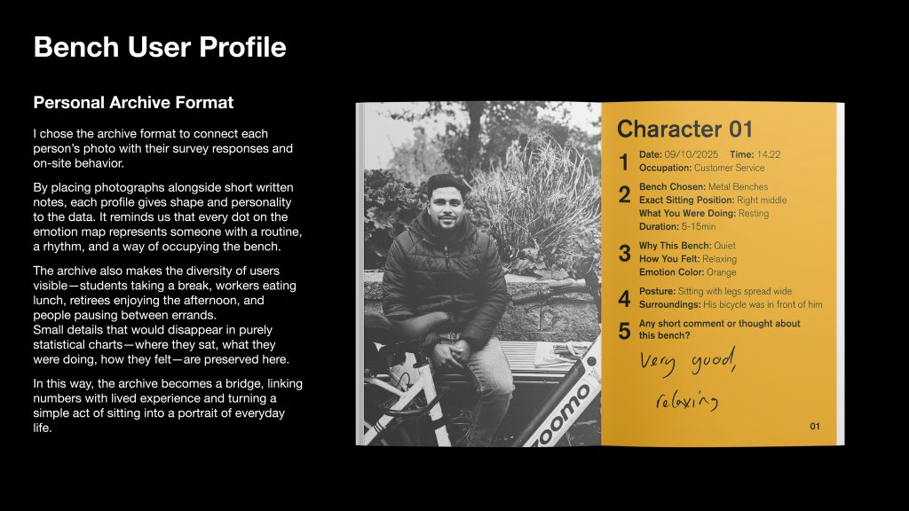 By turning these observations into visual maps and individual “bench profiles,” the project suggests that even simple pieces of public furniture carry memory. They collect traces of daily life—where people sit, how long they stay, and the moods they bring with them—and together these details reveal a slower, more intimate rhythm of the city.